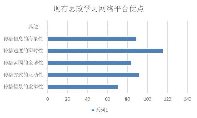 调查数据表明,相比于传统思政教育方式,同学们认为网络思政学习平台具有即时性、互动性、海量性等优点。同时,现有的网络思政学习平台也存在议题设置缺乏新颖性、受众需求缺乏导向型等需要改善之处。