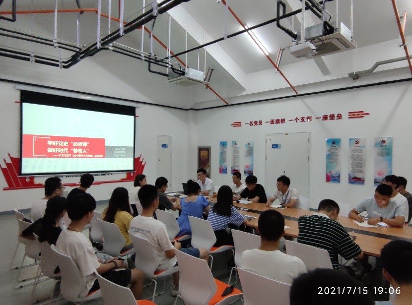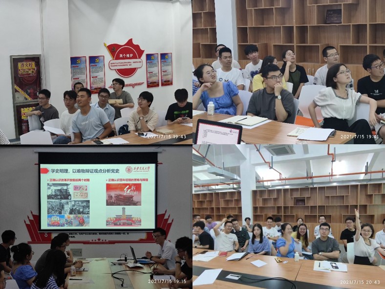 之后,薛成同志从习近平《论中国共产党历史》一书的角度出发,讲了“学好党史‘必修课’,做好时代‘答卷人’”的主题党课。他首先结合实例,阐述了学生党员为什么要学习党史。他从坚持学史明理,以唯物辩证观点分析党史;学史增信,以伟大精神滋养精神血脉;学史崇德,以英雄故事锤炼政治品格;学史力行,以人民情怀践行初心使命四个角度讲述了党史学习教育的重要性和关键性,并希望党支部成员能够加强党史学习,牢记初心使命,坚定理想信念,践行党的宗旨,真正成为实现中华民族伟大复兴的先锋力量。最后,大家结合自身情况,讨论了在党史学习中,如何把自身价值的彰显与党和国家事业紧密结合起来,真正实现党史学习教育由“真知”到“内化”,再到“践行”的过渡。