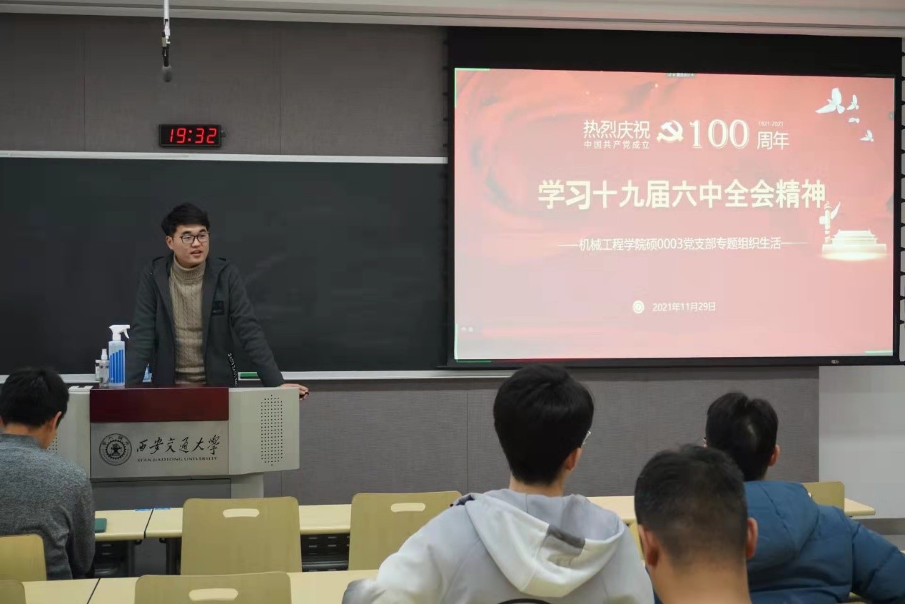 硕0003党支部举办了“十九届六中全会精神解读“专题组织生活会,支部全体党员,部分积极分子及发展对象参加学习,一同分享党的百年奋斗重大成就,学习党的百年奋斗历史经验。
