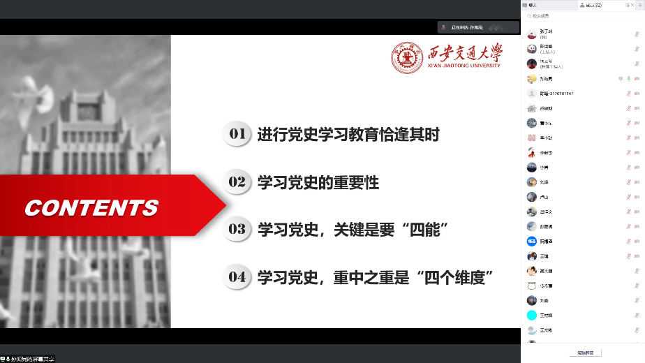 党史是中国共产党自诞生以来领导中国人民为实现中华民族伟大复兴而进行的探索史、奋斗史、创业史,是全体中国人民智慧的结晶。2021年是中国共产党成立100周年。为从党的百年奋斗重大成就和历史经验中汲取继续前进的智慧和力量,全面贯彻新时代中国特色社会主义思想,深刻领悟“两个确立”的决定性意义,巩固深化“不忘初心、牢记使命”主题教育成果,12月21日晚,硕0004支部举办线上党史读书分享会,四位同学分别就自己所读的党史书籍同大家进行交流。