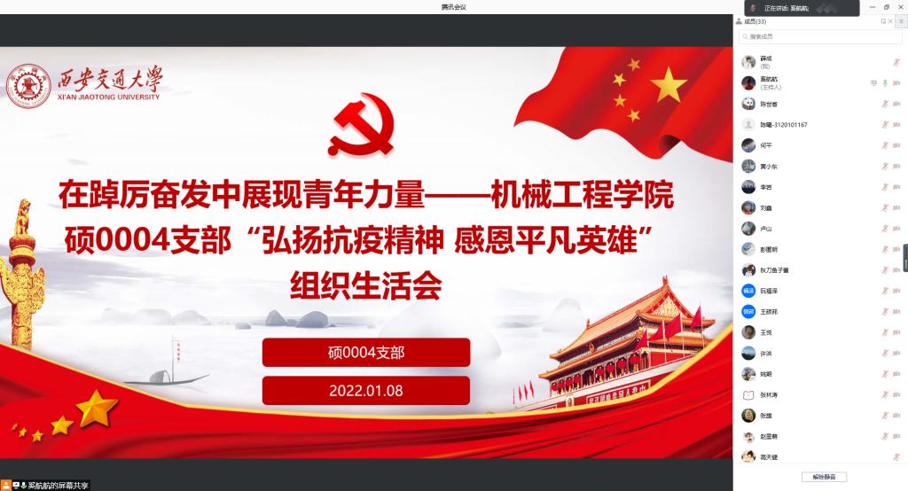 岁末年初,一场突如其来、态势凶猛的新冠肺炎疫情阴影笼罩三秦大地。面对疫情,西安人民站在一起、心手相连、同舟共济、共同坚守、全力应对。为致敬这些奋战一线可爱可敬的无名英雄们,同时发扬我校学子“饮水思源”的优良传统,1月8日,汤不热视频 硕0004党团支部召开线上组织生活会,弘扬抗疫精神,感恩平凡英雄,号召全体同学以青春践行使命担当。