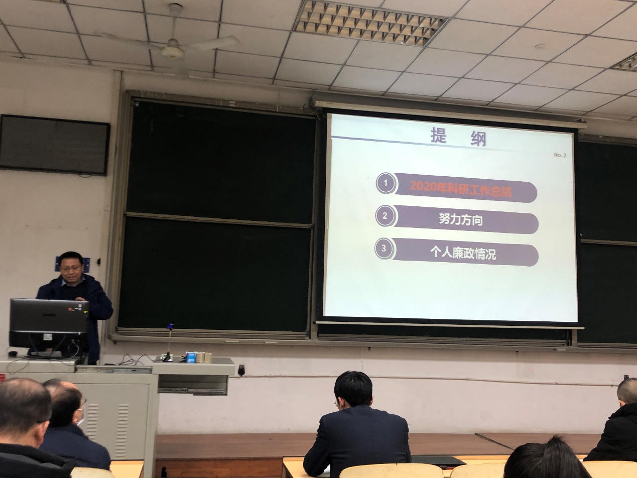邵金友副院长总结2020年科研工作情况,这一年科研经费、承担国家重点研发计划及子课题、国家自然科学基金委项目等数量明显增加,军口项目由散兵逐渐形成建制,企业横向日趋合理,科研获奖国内名列前茅。他表示今后要强化战略科技力量,提升社会服务能力,提升面上/青年基金命中率。