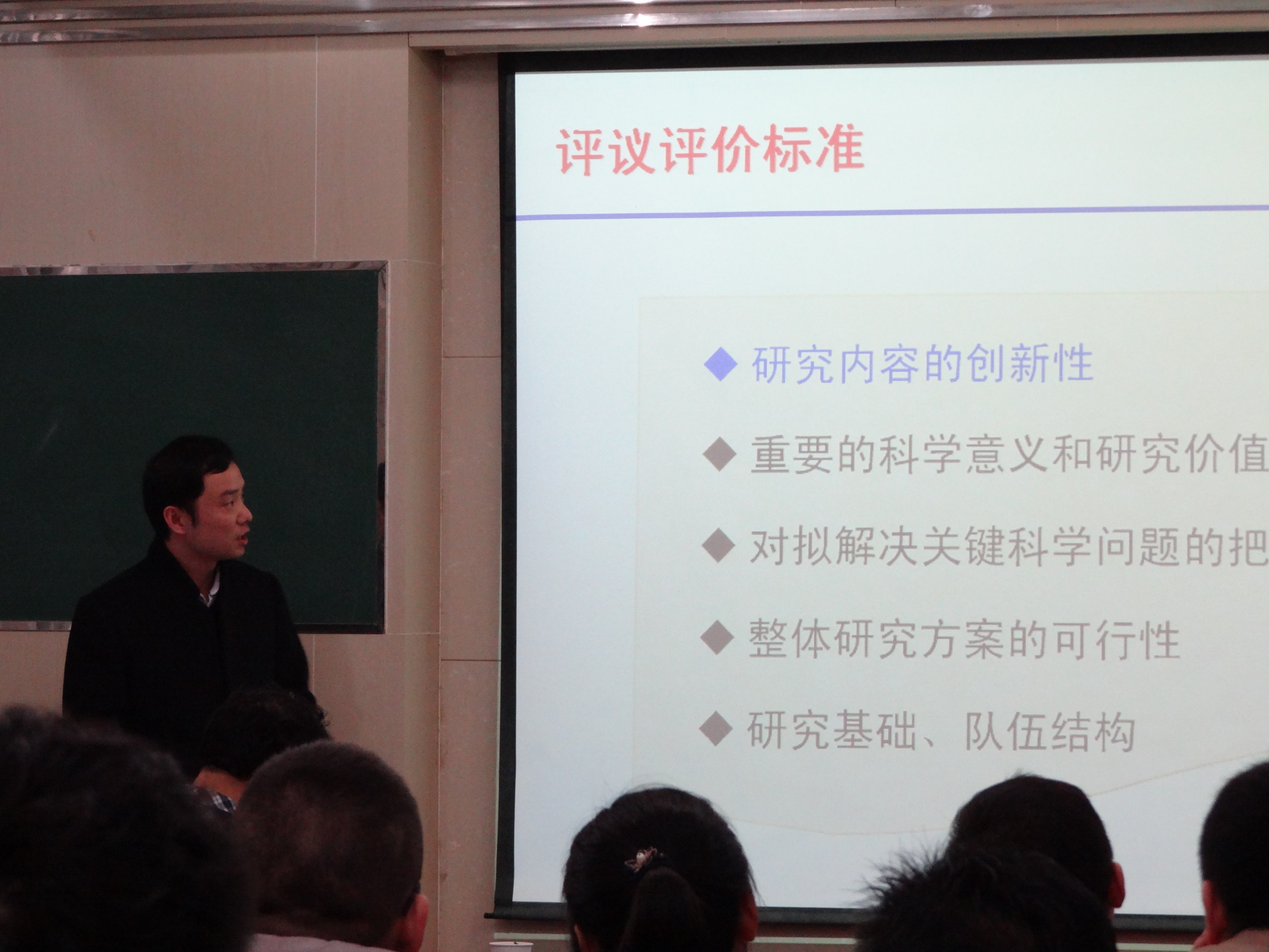 11月26日下午,学院召开了2015年国家自然科学基金项目申报动员暨交流会,会议邀请了校科研院基础与海外办王文副主任、我院雷亚国教授、李晓玲副教授、闫柯师资博士后,由徐光华副院长主持。