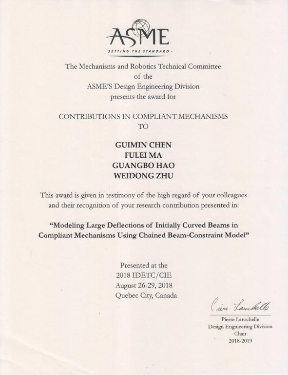 机器人与智能系统研究所陈贵敏教授等的论文“Modeling Large Deflections of Initially Curved Beams in Compliant Mechanisms Using Chained Beam-Constraint-Model”获得美国机械工程师学会机构学与机器人技术委员会的Compliant Mechanisms Award(柔顺机构学奖,奖金1000美元)。本篇论文是2018年ASME柔顺机构奖项的唯一获奖论文。
