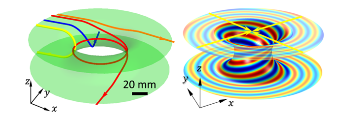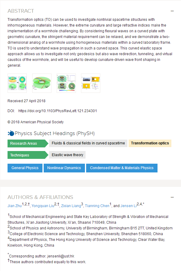 陈天宁课题组与英国伯明翰大学和香港科技大学Jensen Li课题组合作提出采用利用变换理论来研究弯曲时空,建立了弯曲时空的理论变换模型及物理方程。利用纯几何曲率的方法来构造满足变换媒介所需要的材料参数要求,以弹性波在弯曲结构中的传播为研究平台,研究了弹性波在类比虫洞结构中波动特性、遂穿效应、焦散特性等,研究结果表明:弯曲时空中的波传播特性可以通过变换理论用更加简单的模型来研究;所设计的弹性波虫洞结构在虫洞半径大于某个阈值的时候,对波传播具有100%的遂穿效果;入射点和焦散线的尖端点满足特定的成像公式;弹性波作为实现平台可为弹性波在复杂结构中的传播提供一种新的思路。该研究方法和手段可为拓展到声学、光学等其他研究领域,如弯曲空间的波导、表面声传感等。