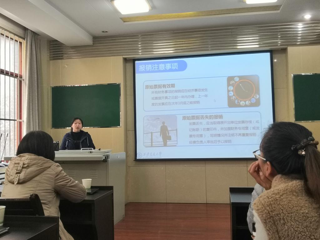 财务处核算管理办公室主管吴婷老师给师生们细致地讲解了日常财务报销政策。吴老师从财务报销的基础知识讲起,详细介绍了网上报账系统操作流程、新启用的学生奖助金发放管理系统、常见报销业务注意事项以及日常报销常见错误等内容,全面系统地介绍了财务报销相关规定。