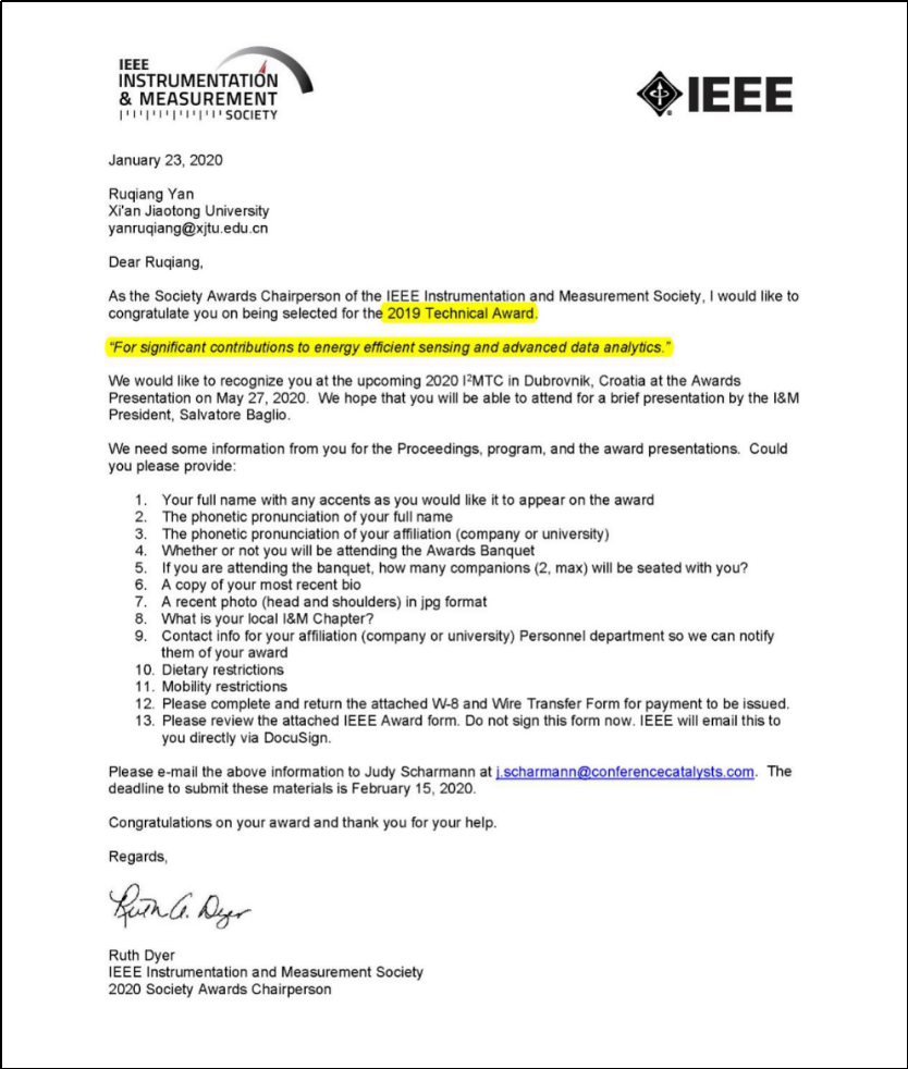 附:IEEE仪器与测量学会发送给严如强教授的获奖通知函