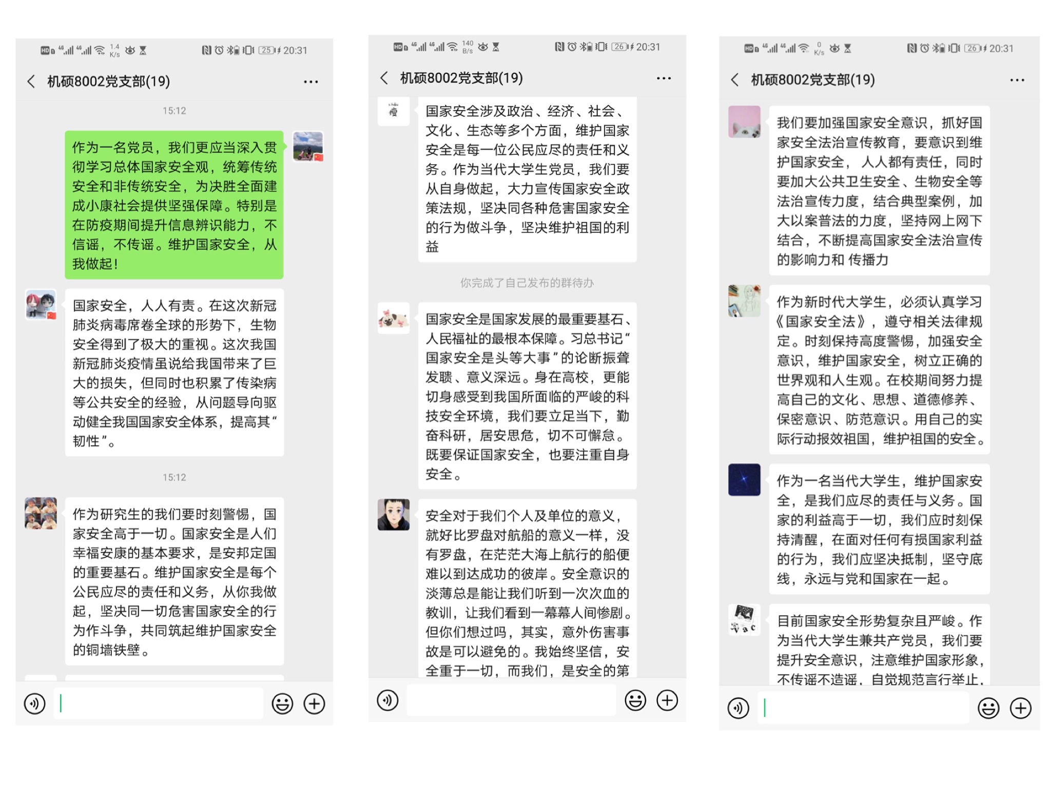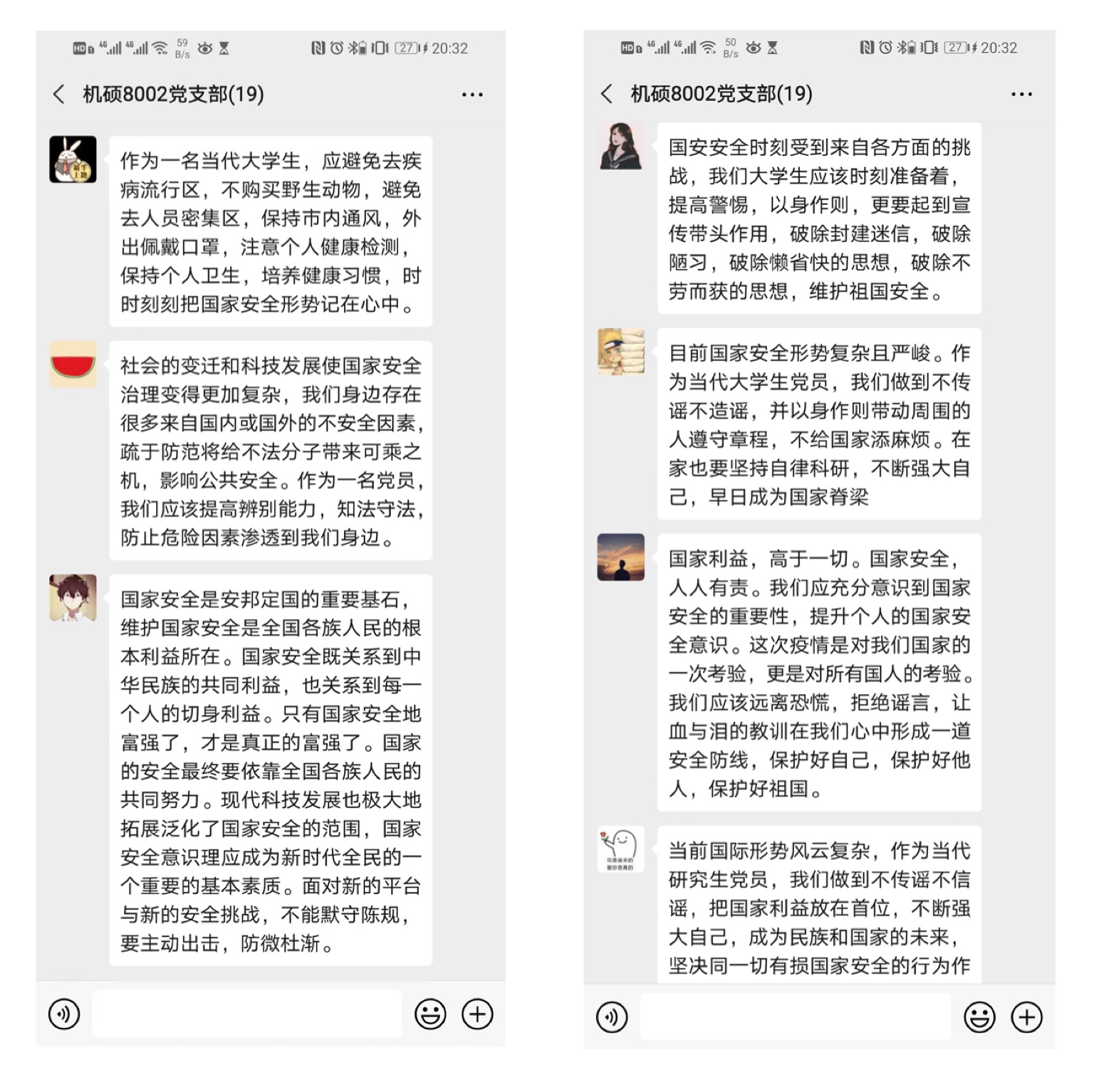 硕8002班党支部通过腾讯会议及微信群开展了主题为“同上一堂国家安全教育课”的线上党组织生活会,会议由党支部书记雷子豪主持。