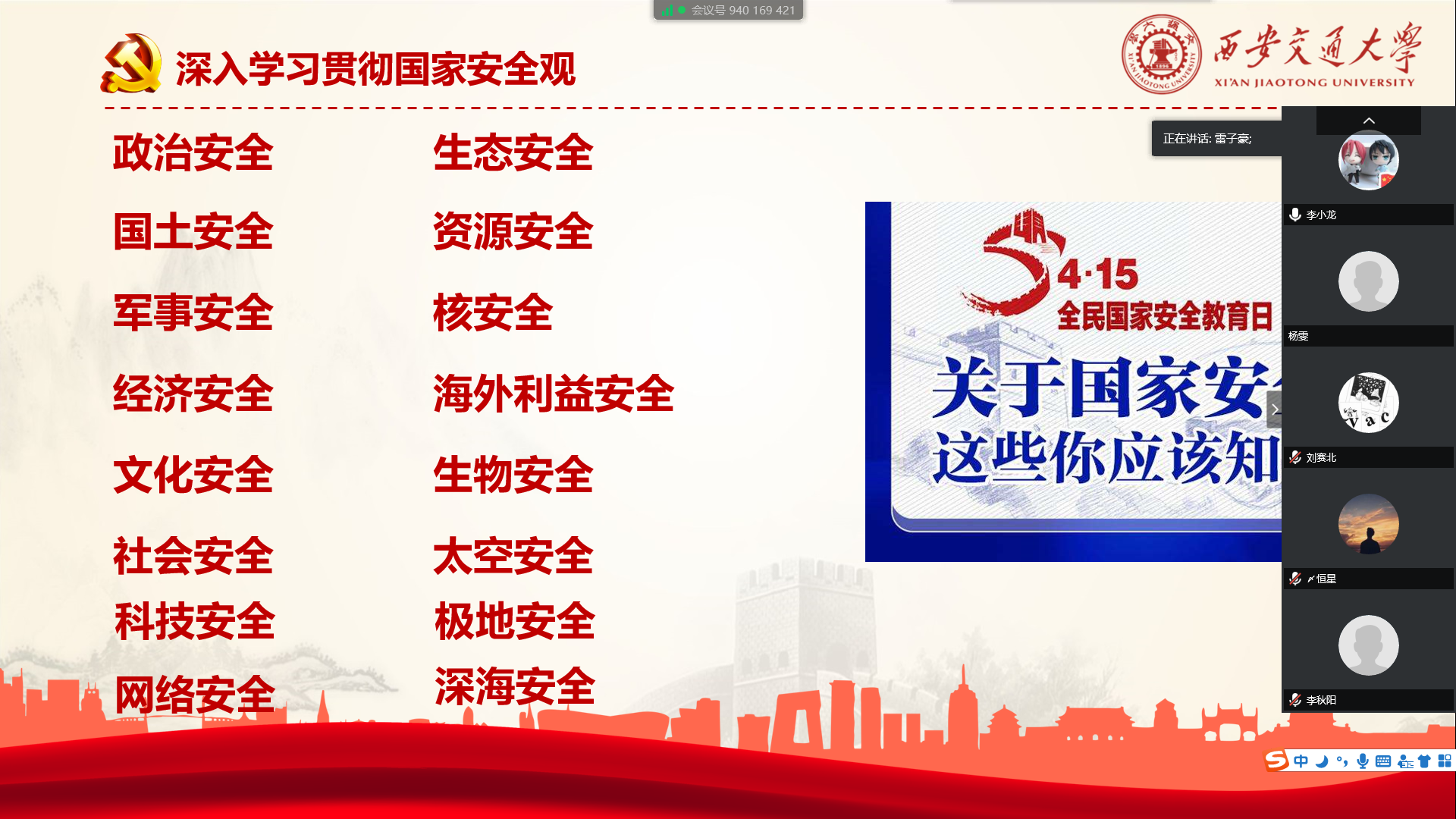 2020年4月15日下午14:00,硕8002党支部通过腾讯会议及微信群开展了主题为“同上一堂国家安全教育课”的线上党组织生活会,会议由党支部书记雷子豪主持。会议首先认真学习了近几年来习近平总书记围绕总体国家安全观发表的一系列重要论述。理论学习之后支部同志共同收看了清华大学公共安全研究院范维澄院士讲授的高校公开课“总体国家安全观视角下的疫情防控”。在公开课之后的交流讨论中,来自湖北襄阳的李小龙同志表示:“在这次新冠肺炎病毒席卷全球的形势下,生物安全得到了极大的重视。这次我国新冠肺炎疫情虽说给我国带来了巨大的损失,但同时也积累了传染病等公共安全的经验,从问题导向驱动健全我国国家安全体系,提高其‘韧性’”。