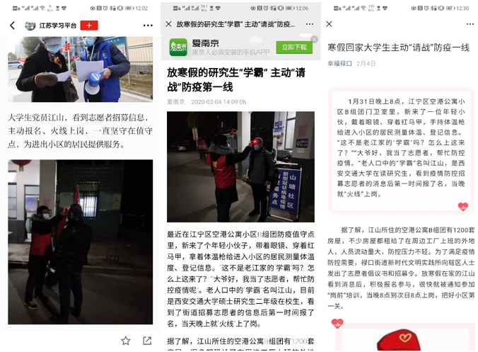 江山同志带头响应党的号召,毅然投身到社区防疫志愿服务活动中。在社区防疫工作中,协助社区工作人员进行防疫知识宣传、社区居民体温测量登记、外省归来务工人员信息登记、社区值守值班等志愿服务活动。从1月31日起,一直到2月29日,他通宵值过班,站过岗,为社区的防疫工作做出力所能及的贡献,也得到了社区工作人员的肯定与感谢,得到了社区居民朋友的认可。江山同学的事迹受到了“学习强国”、“南京晨报”以及当地政府的报道,充分展现了汤不热视频