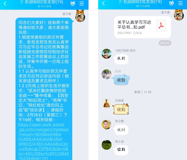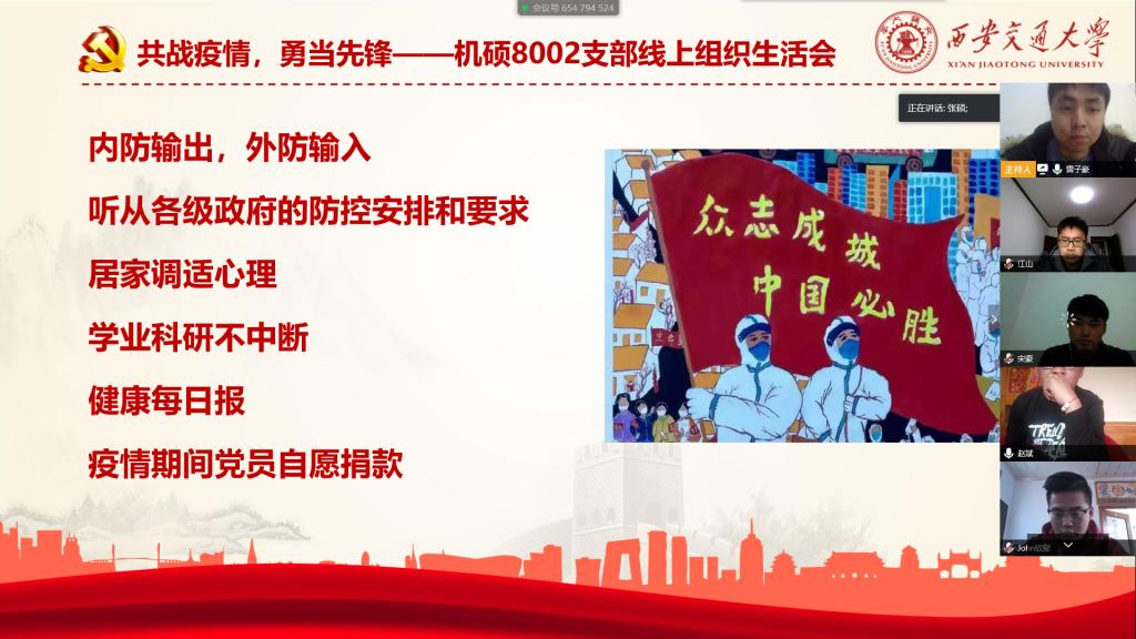 2020年2月26日下午15:30,硕8002党支部通过QQ群开展了的线上党组织生活会,会议由党支书雷子豪主持。会议首先认真学习了习近平总书记关于打赢疫情防控阻击战的系列讲话及重要指示,传达了上级党委关于疫情防控和开展2020年党支部组织生活的工作部署,支部同志也通报了各自的健康状况。下午16:00时分党支部全体同志在各自家中集中观看了《西安交大“80后院士”、“男神”书记、“网红校长”邀你同上战“疫”成长课》。观看直播后,支部就同志就“疫情期间如何进一步弘扬‘西迁精神’”展开交流讨论。“这一场突发的疫情让90后站上了历史舞台,他们临危受命,勇担重任。正如王树国校长所言,中华民族精神传承不息,中华民族才能勇往直前无战不胜。疫情当前,交大人应当主动参与其中,与祖国人民共命运,同成长,以实际行动践行西迁精神。不断弘扬,勇敢担当,成为新的民族脊梁。”支部宣传委员张硕在发言中提到。