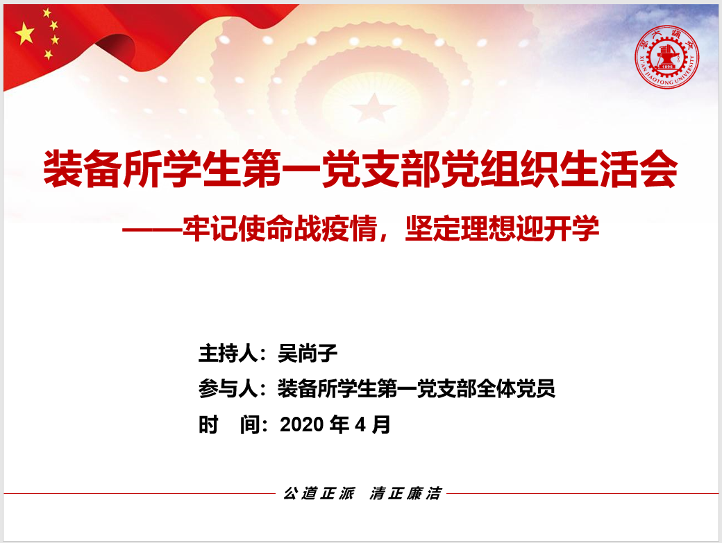 装备所博士生第一党支部开展了主题为“牢记使命战疫情,坚定理想迎开学”的线上党组织生活会,会议由党支部书记吴尚子主持。