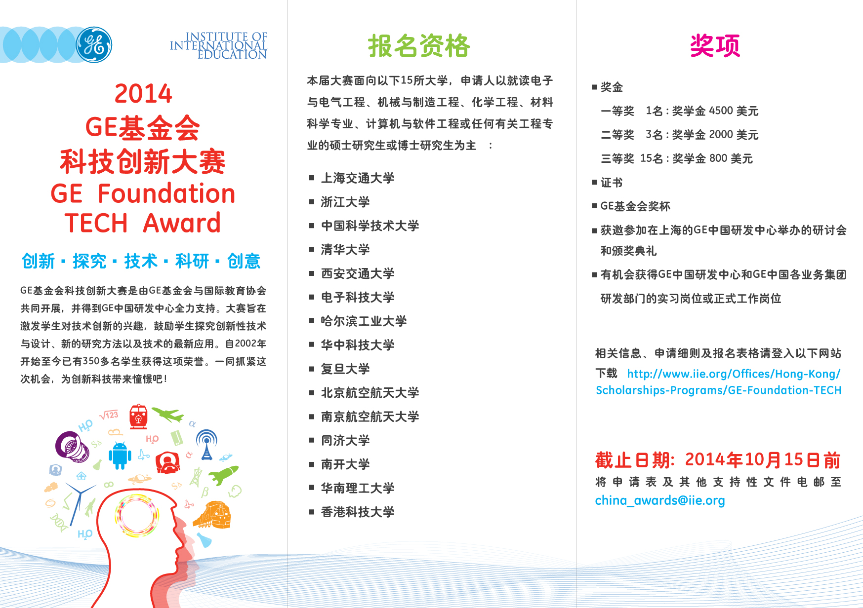 2014 GE基金会科技创新大赛现已经启动。本次大赛是由国际教育协会和GE中国研发中心共同开展,从2002年首次展开至今已经有超过350人获奖。